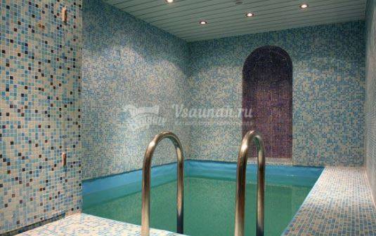 Бассейн с чистой водой. Веники. Массаж. Банные принадлежности.
